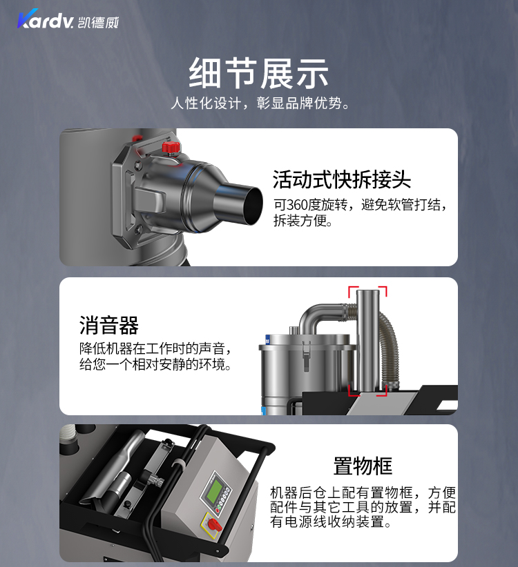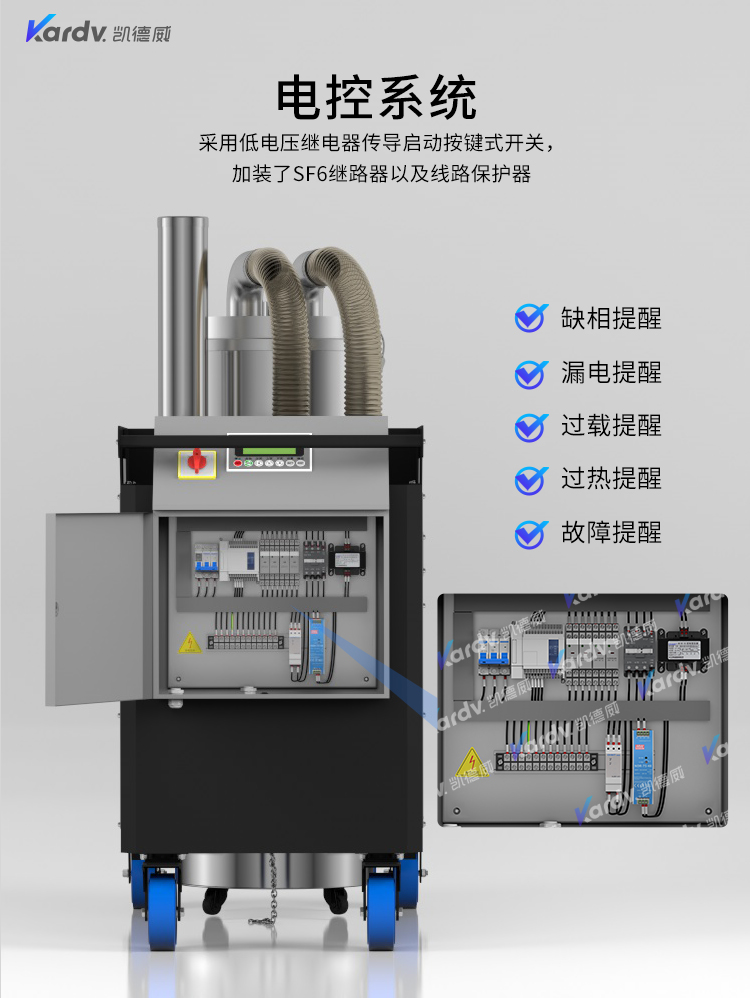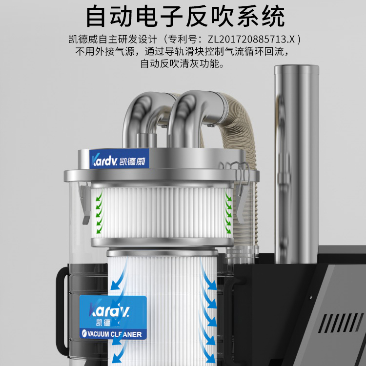 SK - F系列是我司自主研發(fā)的智能型工業(yè)吸塵器。具有以下六大亮點: A.整機采用工業(yè)設計風格,外形剛勁有力,做工精良美觀。 B.集塵桶固定把手設計。C.采用直徑160mm的TPE靜音前后大輪 D.電控系統(tǒng)采用凱德威自主設計帶有液晶顯示屏的智能PLC電控控制系統(tǒng) E.動力源采用凱德威FY系列定制主機,并選用NSK耐高溫防塵軸承。 F.全自動電子反吹清灰系統(tǒng)具有人工免保養(yǎng),吸力強勁、穩(wěn)定,故障率低。 G.集塵系統(tǒng)采用100L不銹鋼材質(zhì)的上下分離桶,桶壁光滑易清理。