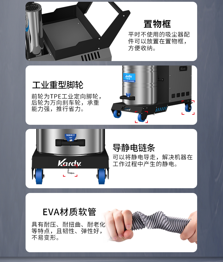 SK-610是一款自主研發(fā)的工業(yè)吸塵器。采用工業(yè)設(shè)計(jì)風(fēng)格,做工好,美觀大氣,黑灰色調(diào)搭配彰顯本機(jī)的工業(yè)風(fēng)格。電控系統(tǒng)采用簡(jiǎn)單易操作的按鍵式控制系統(tǒng),有防缺相,漏電,過(guò)載的保護(hù)。動(dòng)力源采用凱德威FY2.2定制主機(jī),主機(jī)葉片以及外殼為合金材料壓鑄成型,再經(jīng)過(guò)整體拋光噴涂,相對(duì)控制了整機(jī)的熱脹冷縮,風(fēng)量穩(wěn)定,并選用了質(zhì)量穩(wěn)定的軸承。