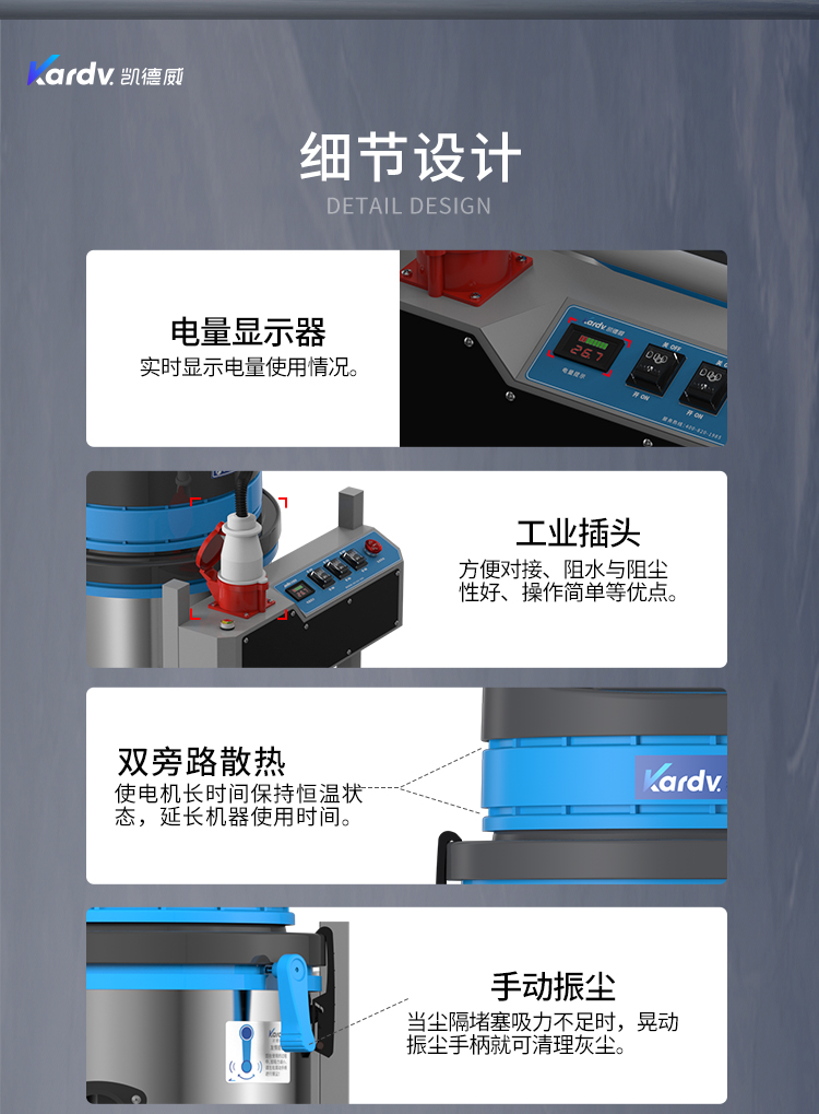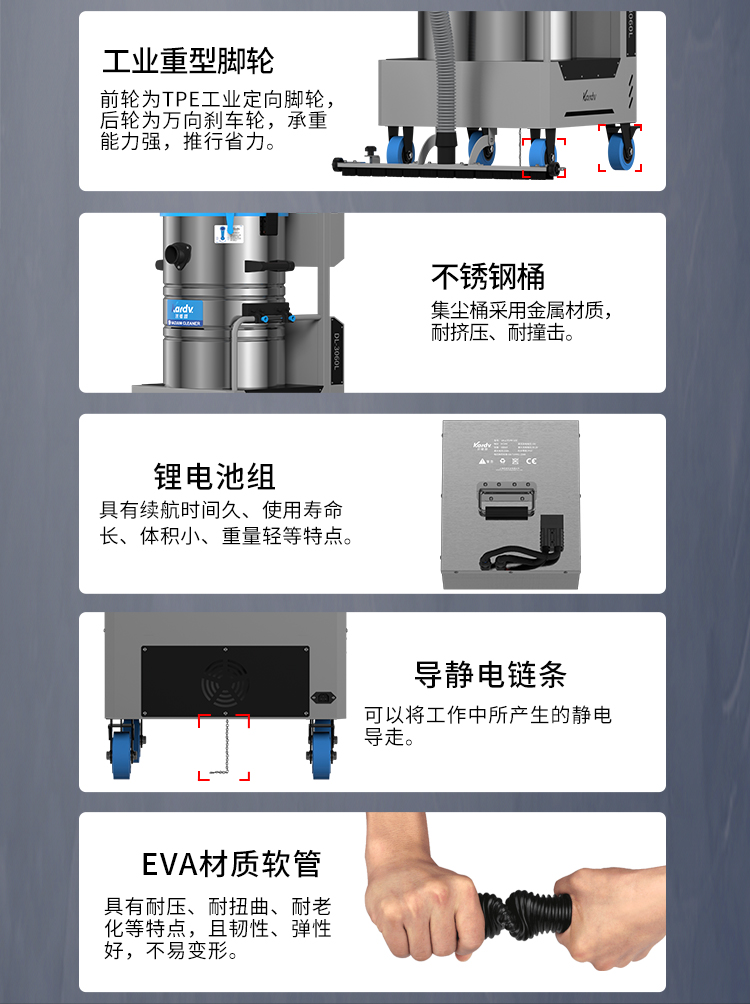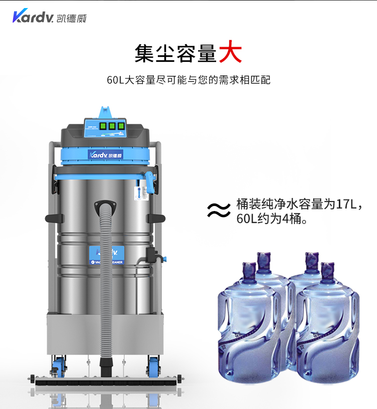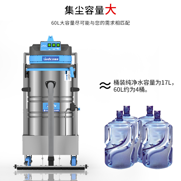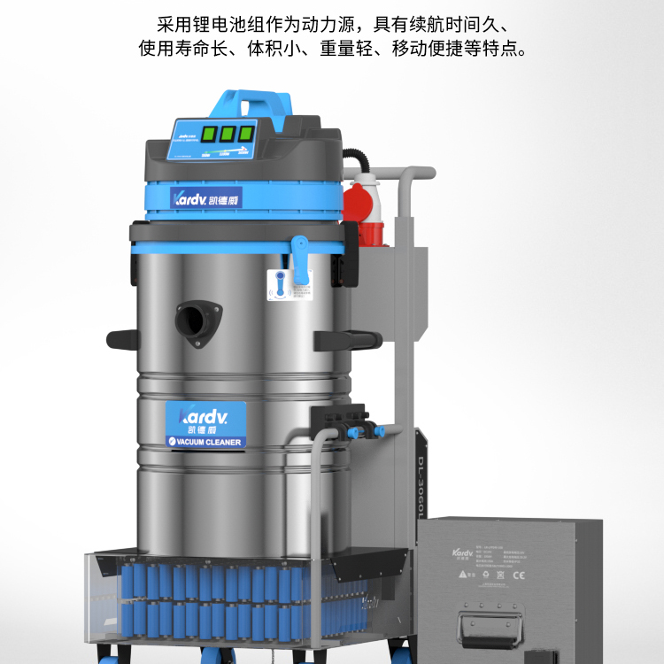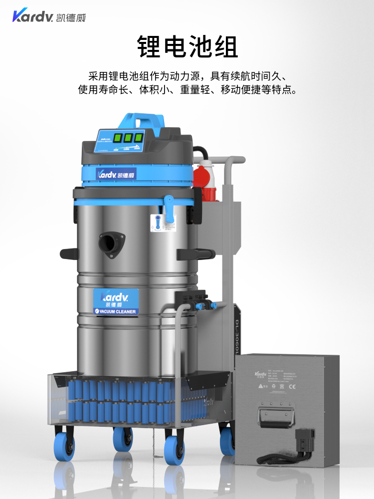 DL-3060L凱德威鋰電池吸塵器是我司的一款充電式工業(yè)吸塵器,摒棄了常規(guī)拖線式吸塵器使用范圍的局限性。此款吸塵器利用鋰電池組做為電力源,不需外接電源,操作簡單方便。體積小,重量輕,移動便捷,續(xù)航時間久,隨充隨用,簡單方便。機器除常規(guī)手持式吸塵外,裝置有60cm寬可推吸扒頭,可以邊推邊吸。