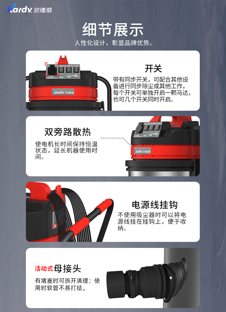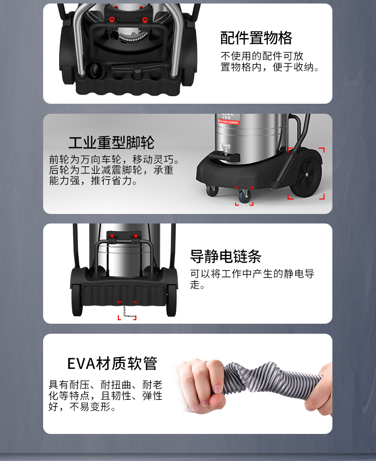 GS-3078S是一款工業(yè)型吸塵器,集塵桶為80L,為不銹鋼材質(zhì),配有車架,在移動時輕巧方便,車架底座為PP材質(zhì),底座上有置物格,可放置配件或工具方便收納和使用;可以用在工廠、倉庫或建筑工地等場所清理灰塵等,在商業(yè)環(huán)境中也可以使用。