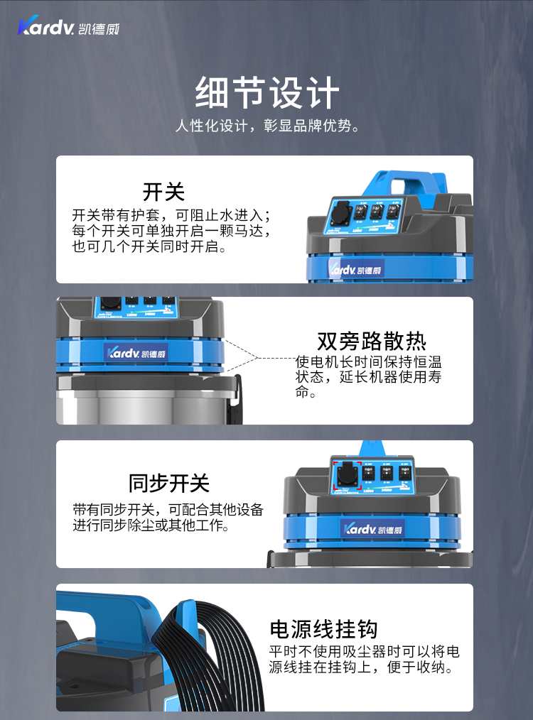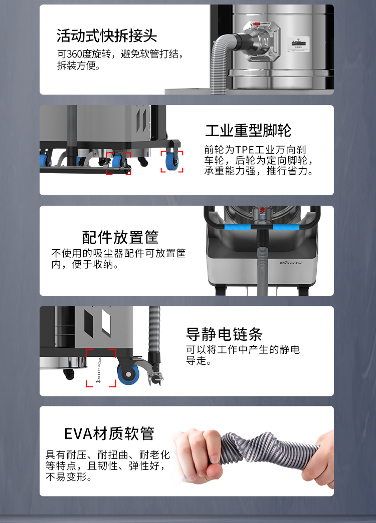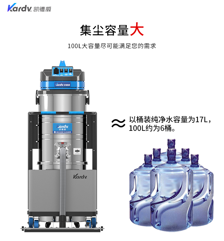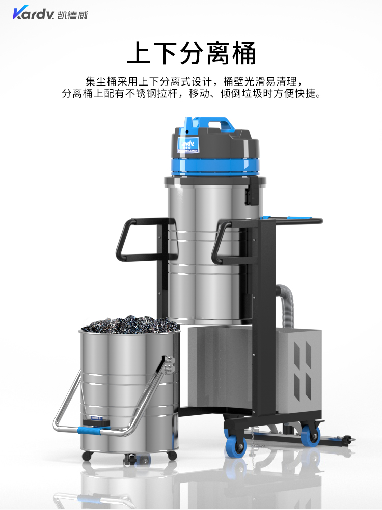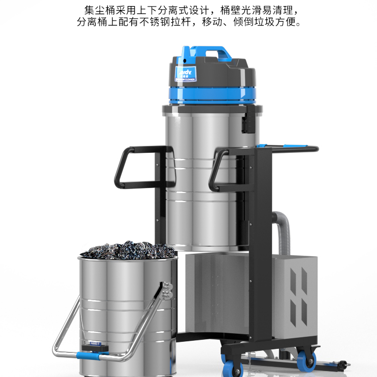 DL-3010BF是一款干濕兩用型工商業(yè)吸塵器,電壓220v,有3顆馬達組成,每個馬達1200w功率,合計功率360W,帶一套40口徑GI配件和一套60公分寬的推吸扒頭,工作直徑32米左右??筛鶕?jù)不同工況選擇單獨開一個電機或兩個/三個同時開,100L不銹鋼集塵桶采用上下分離式設計,桶壁光滑易清理,分離桶上配有不銹鋼拉桿,移動、傾倒垃圾時方便;配有反吹清灰裝置,當吸力不足時,可按下反吹手柄幾秒進行反吹清理。機器配有置物框,便于收納配件。機器可以邊推邊吸。適用于五金、食品、電機、機械、化工等工商