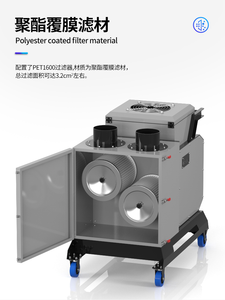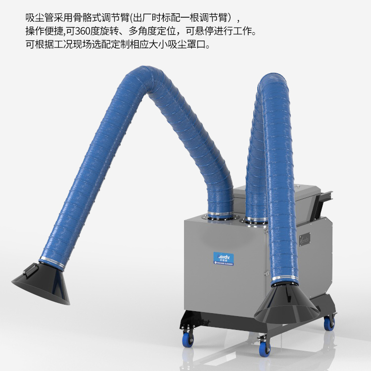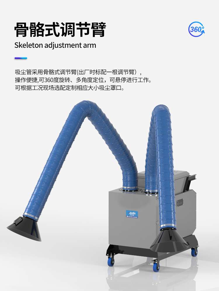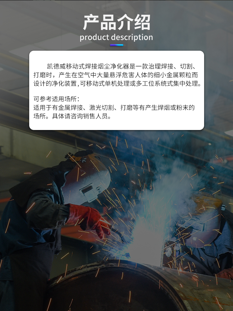 金屬焊接、激光切割、打磨作業(yè)時,大量煙塵懸浮在車間內,被吸入人體肺部影響身體健康,因此在焊接煙塵進入焊工呼吸區(qū)前把這些煙塵進行凈化處理。凱德威移動式焊接煙塵凈化器是一款治理焊接、切割、打磨時,產生在空氣中大量懸浮危害人體的細小煙塵顆粒而設計的凈化裝置,可移動式單機處理或多工位系統集中式處理。配有1根2.5米長的吸氣臂,在不同的工作地點移動靈活,操作方便。